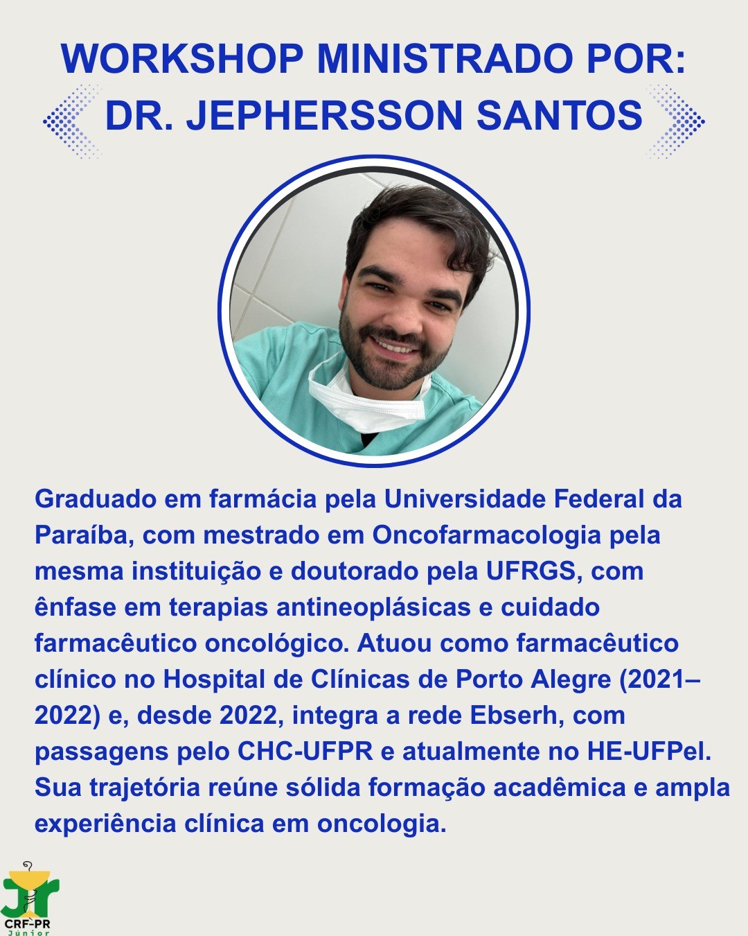 - Jephersson Santos: O palestrante é graduado em Farmácia pela Universidade Federal da Paraíba (UFPB), com mestrado em Oncofarmacologia pela mesma instituição. Obteve o título de doutor pela Universidade Federal do Rio Grande do Sul (UFRGS), com foco em terapias antineoplásicas e cuidado farmacêutico oncológico. Atuou como farmacêutico clínico no Hospital de Clínicas de Porto Alegre entre 2021 e 2022, onde desenvolveu atividades diretamente ligadas à atenção ao paciente oncológico. Desde 2022, integra a rede Ebserh, com experiência nos serviços do Complexo Hospital de Clínicas da Universidade Federal do Paraná (CHC-UFPR) e, atualmente, no Hospital Escola da Universidade Federal de Pelotas (HE-UFPel). Sua trajetória combina sólida formação acadêmica com ampla vivência clínica em oncologia.