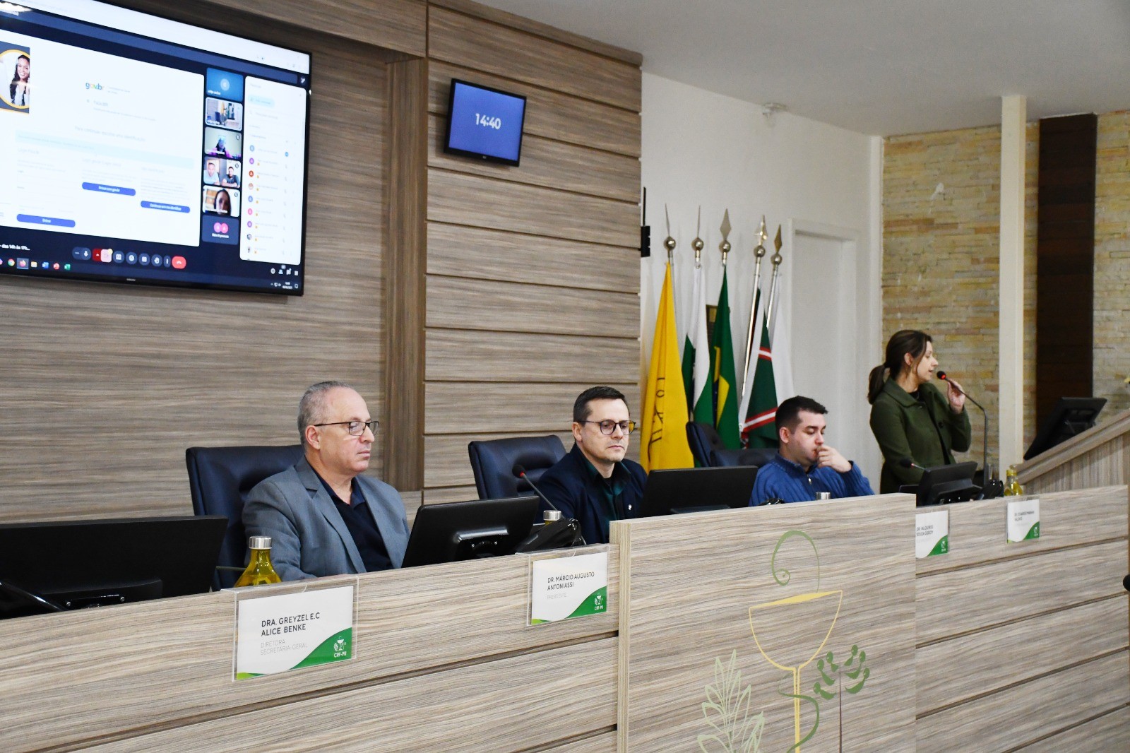 Após o juramento, os novos farmacêuticos participaram da Reunião de Orientação, que abordou temas fundamentais para a atuação profissional. A reunião contou com a participação das gerentes das áreas técnicas do CRF-PR: a Dra. Tayná Lima, gerente do setor de Fiscalização, destacou a importância do papel do farmacêutico no cumprimento das normas legais que regem a profissão, ressaltando a atuação da fiscalização nas diversas áreas onde o profissional está presente. Dra. Fernanda Penteado, gerente do setor de Ética, reforçou os princípios éticos que norteiam a prática profissional e Dr. Jakson Rapkiewicz, do Departamento Técnico-Científico do CRF-PR, que apresentou os trabalhos do setor, programas de capacitação e apoio técnico oferecidos pelo Conselho.